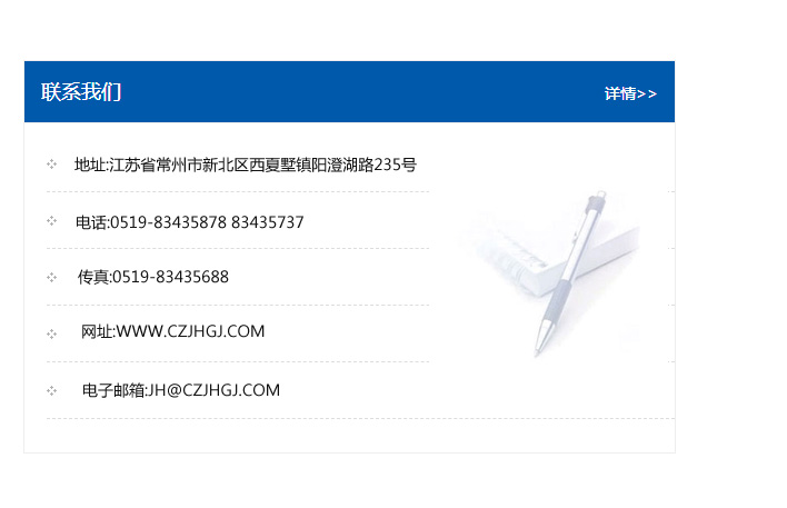 地址:常州市新北區友邦商務大廈1幢16、17層  電話:0519-85101652  傳真:0519-85112595  郵編:213022  網址:www.cz-jiayue_cn.mojiego.com  郵箱:xiajifengaa@163.com